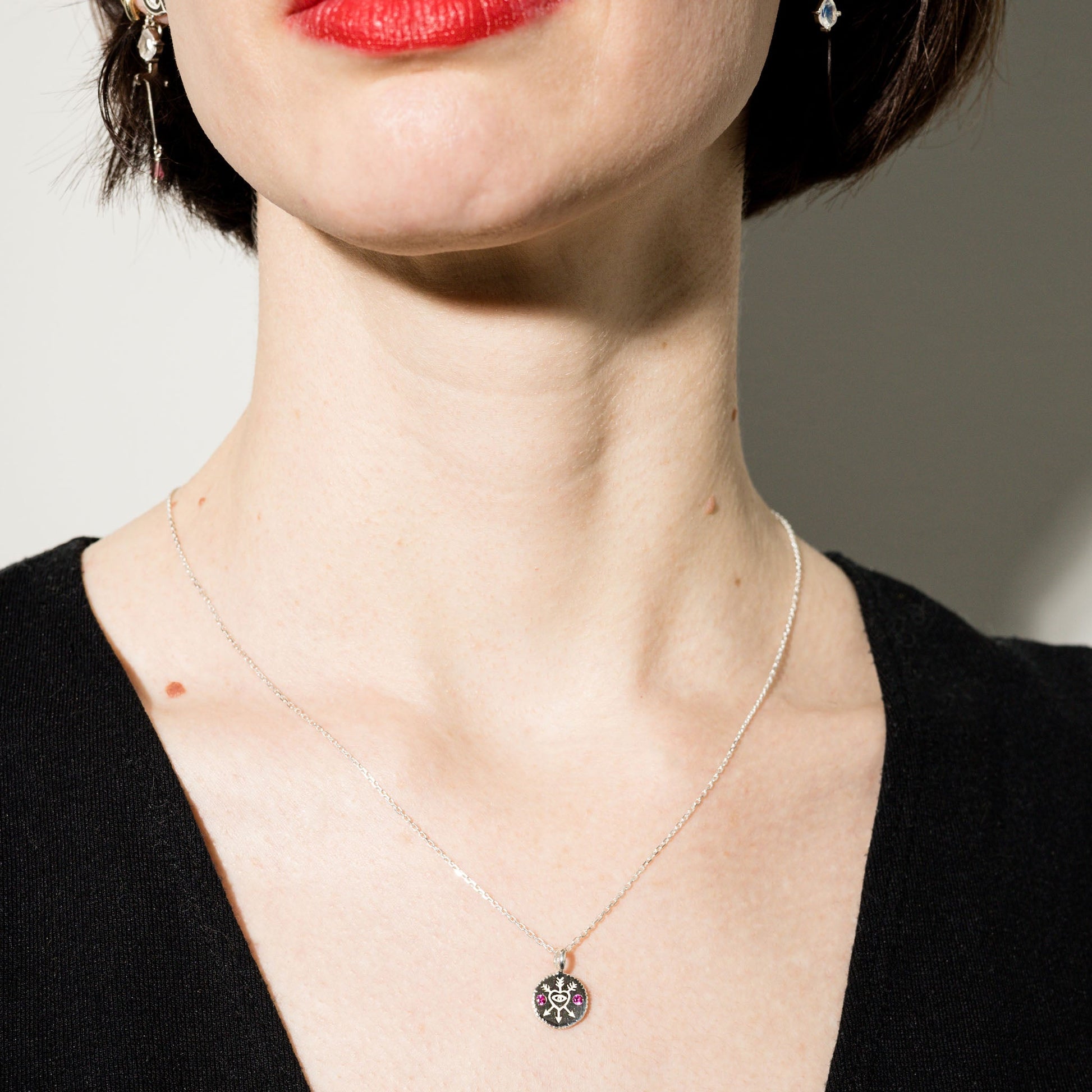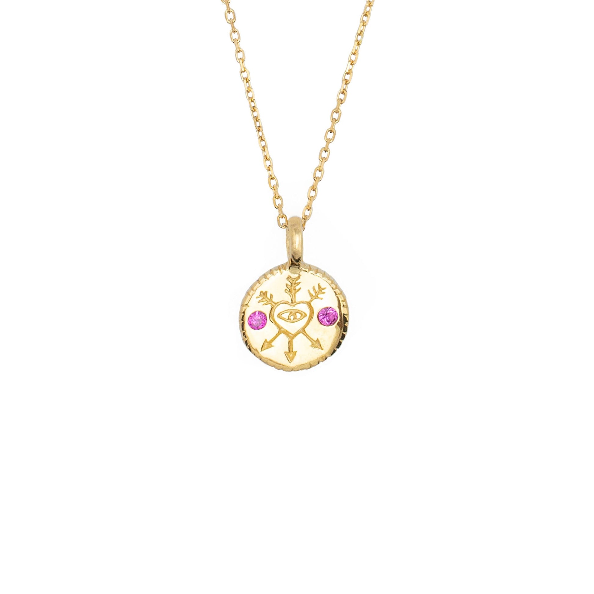 We've got your back. This pendant combines symbols of affection (heart), insight (eye), and friendship (arrows) into a talisman inspired by those that empower and uplift us.