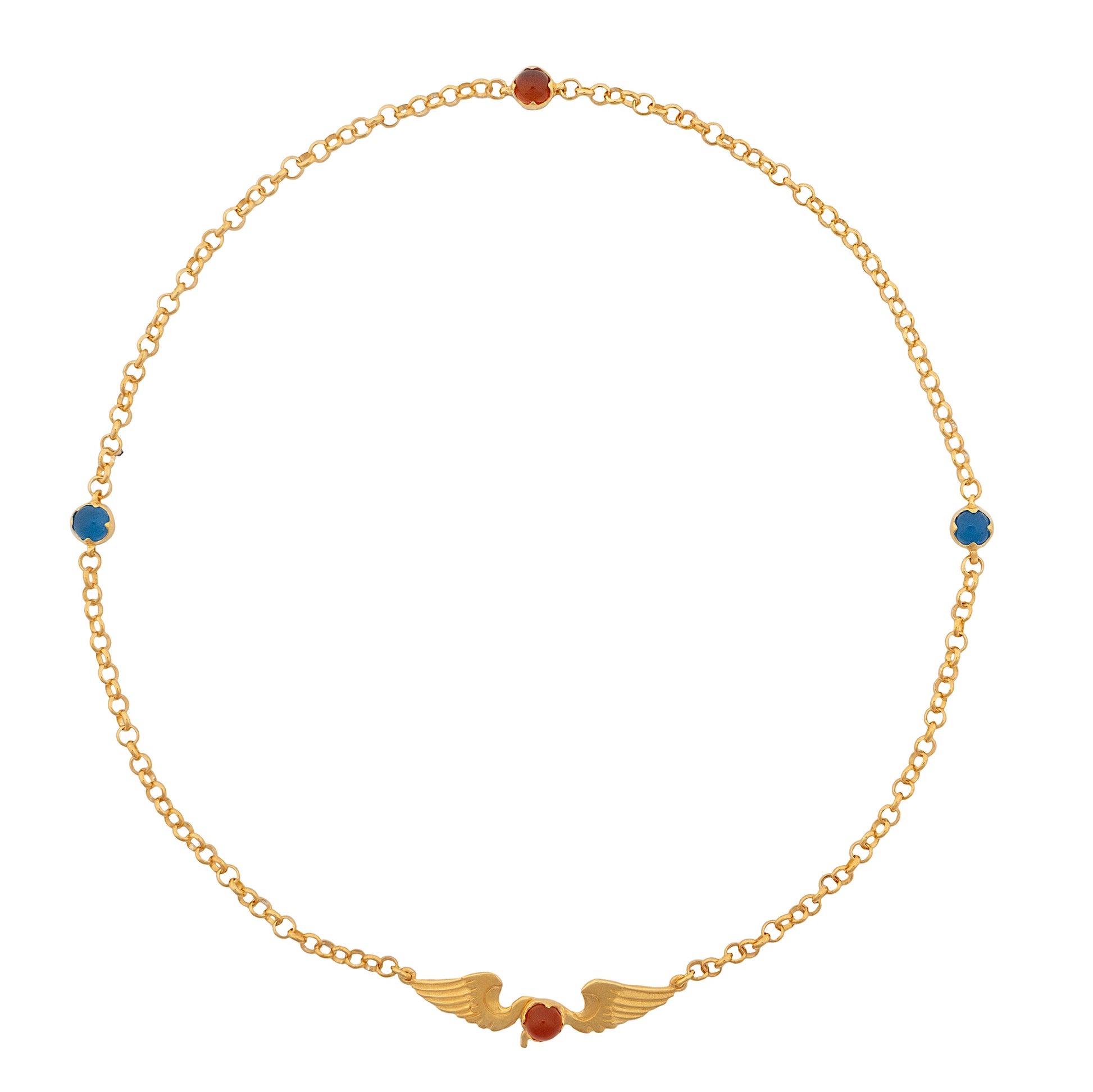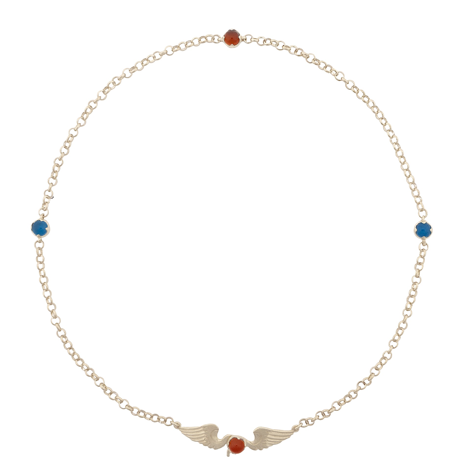 This necklace is inspired by journeys beyond the ordinary - embodying the grace of flight with elements of poise and purpose. The intricate wing clasp is enhanced with stunning blue agate and carnelian gemstones, chosen for their vibrant hues. Blue agate reflects the tranquil vastness of the sky and the calm clarity of the stars, while the carnelian evokes the fiery brilliance of celestial bodies and the warmth of a guiding light.