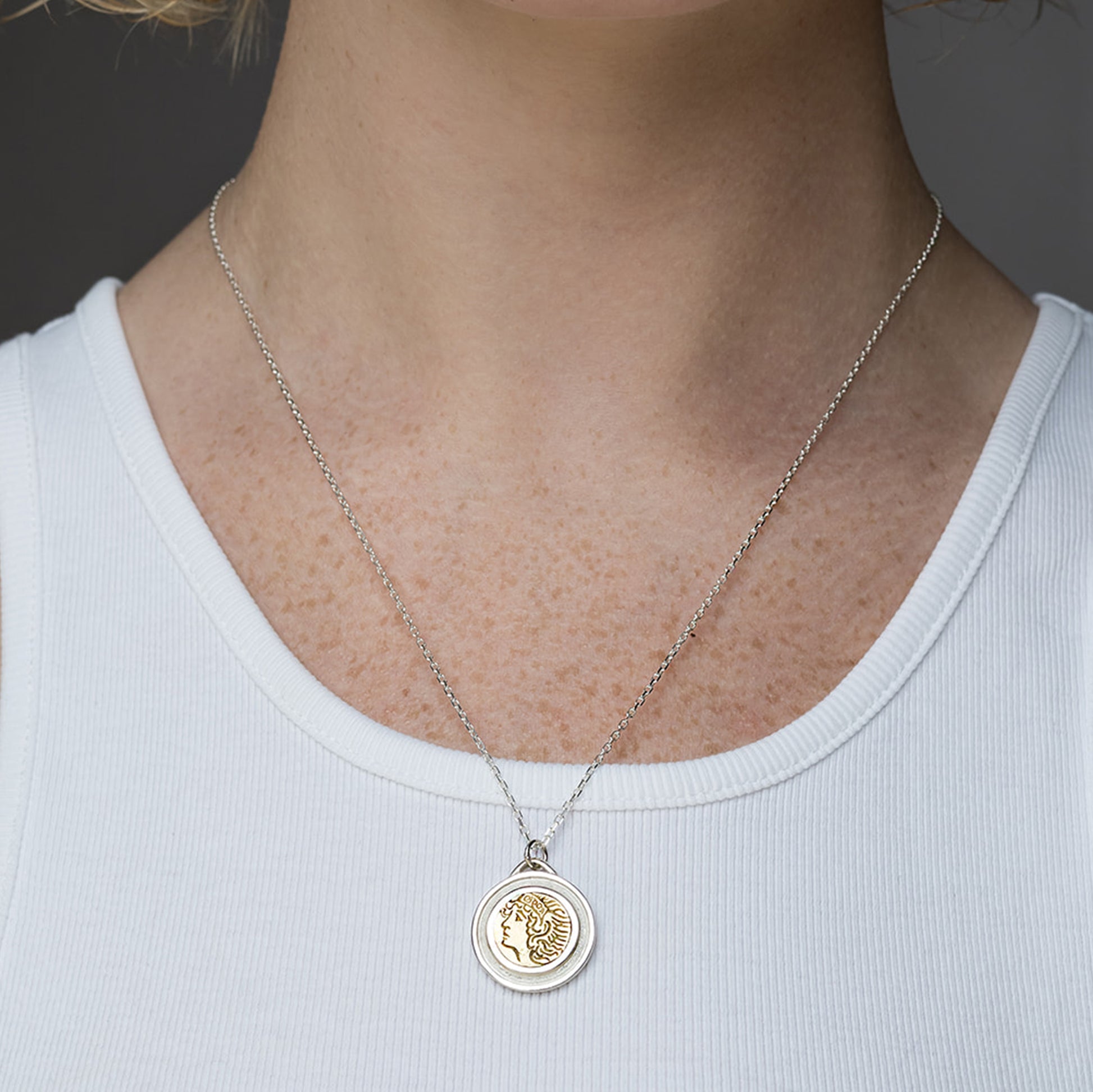 Crafted with meticulous attention to detail in two-toned metal, the Guardian Necklace features an intricately designed pendant adorned with a powerful image of a female warrior. Her commanding presence and vigilant gaze symbolizes a celestial guardian who guides and protects those who fight for righteousness and honor. Don't miss the cut-out star detailing on the reverse.