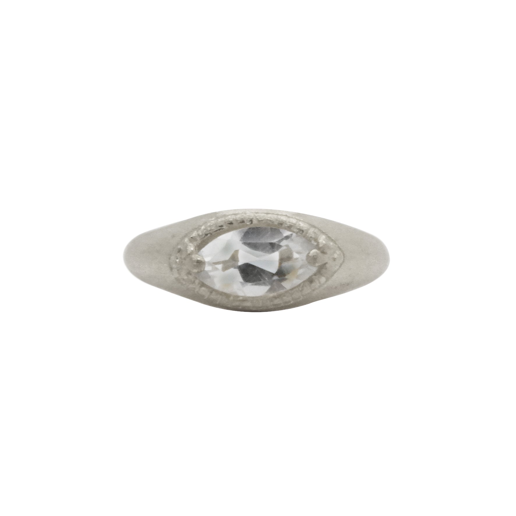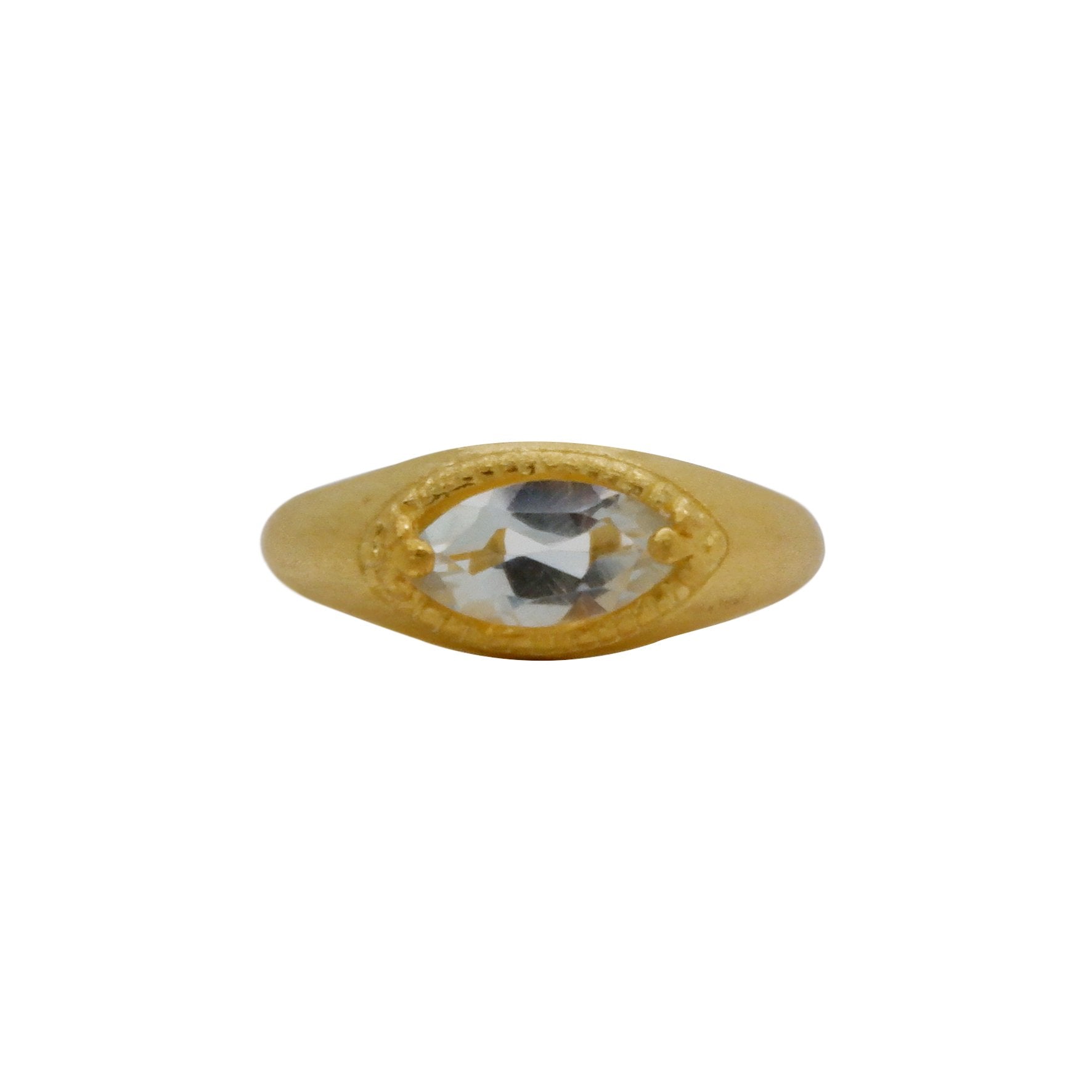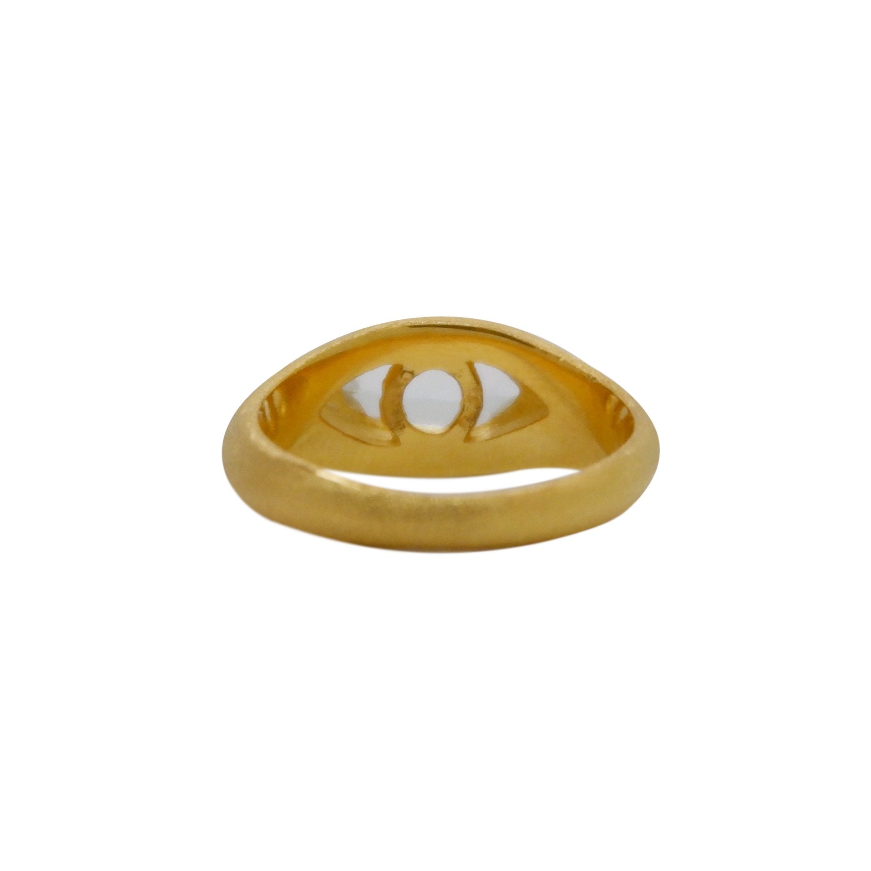 Catha is the mythological mother sun of the ancient Etruscans and is associated with daybreak. The refined and regal design of this piece with a its sparking white topaz is sure to make you feel like a goddess too. Don't miss the cut-out eye behind the stone.