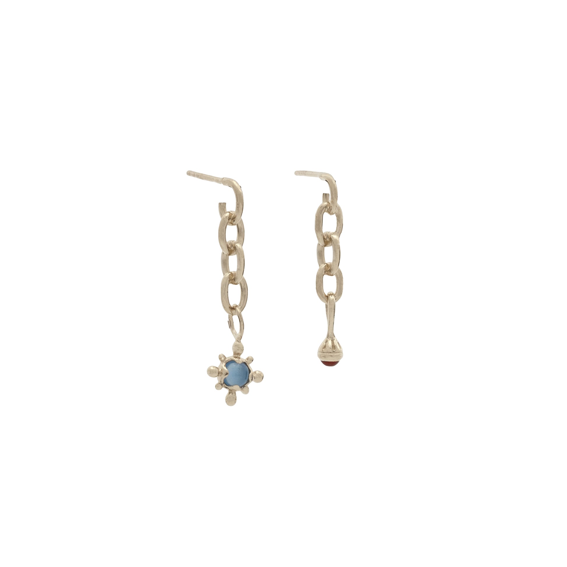 Our Chain Earrings are elevated with the addition of elegant, mixed gemstone charms. On one side, our Bell Charm with Carnelian (a stone of warmth and creativity). On the other, our Mini Medallion Charm with blue agate (a stone of calm and courage).