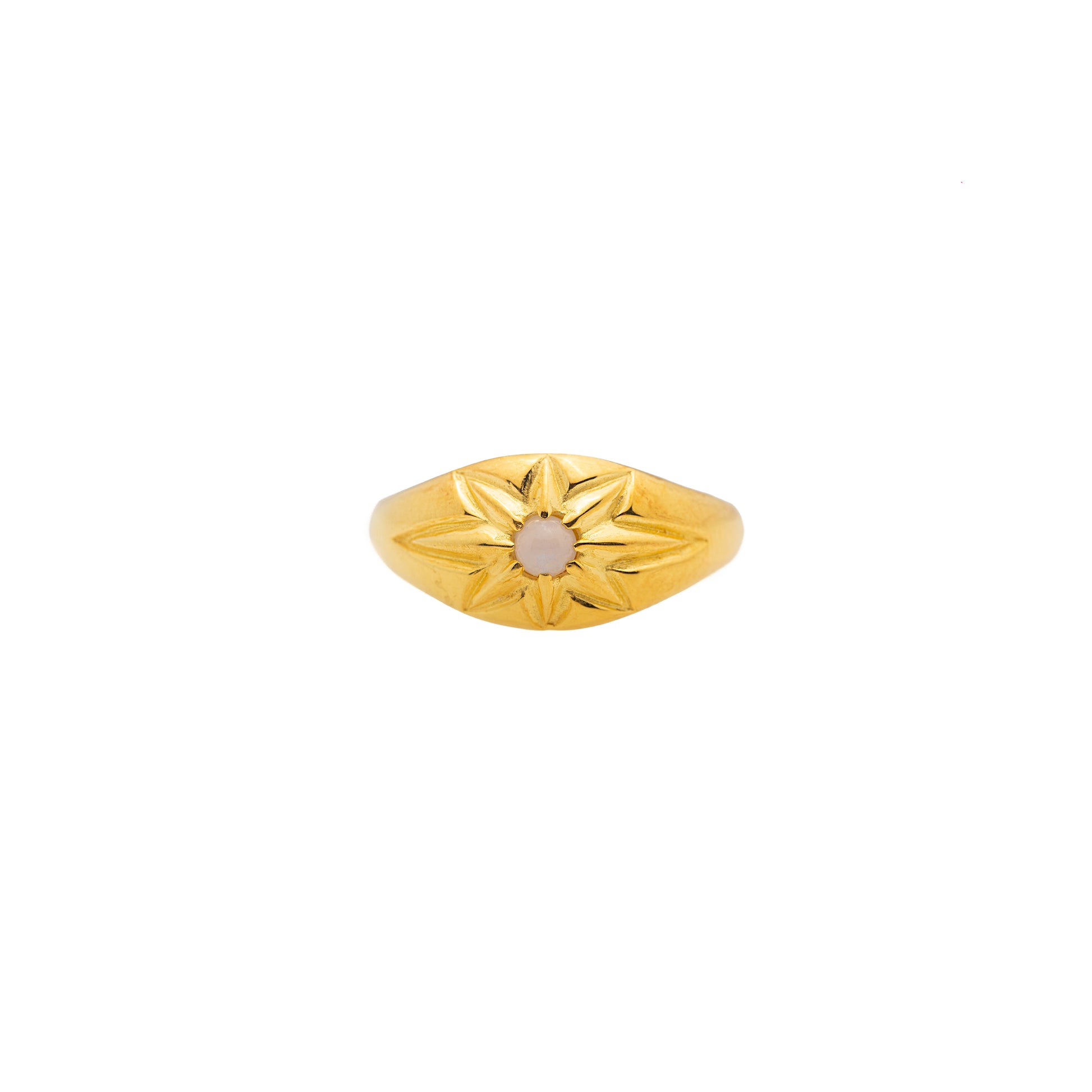 Steorra is the Old English origin of the word star. This ring beams with sculpted rays of starlight emanating from a glowing blue-lace agate - a stone connected with clarity, calm, and promoting communication.